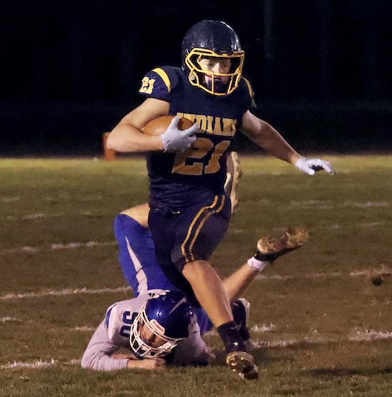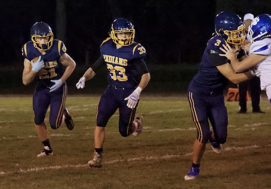 Another forced punt by the Indians’ ‘D’ gave them the ball at their own 35 as the second quarter wound down. After a couple of gains by Kegan Lane, Hess found Cam Stahli for a 57-yard TD pass and after Churchill’s good PAT, CV led 14-0 with 2:29 left before the break.