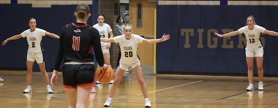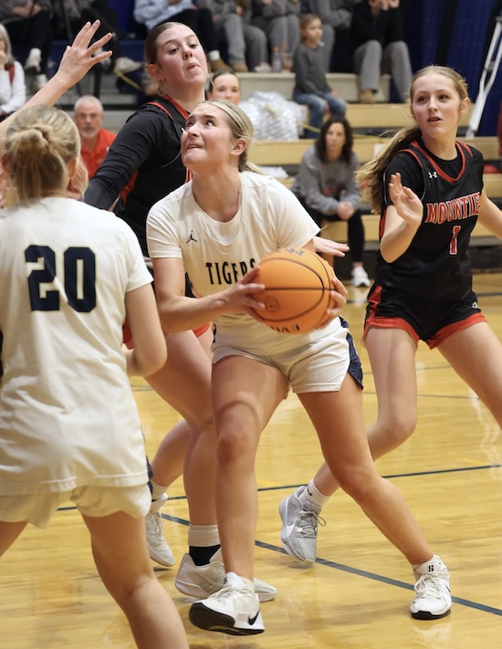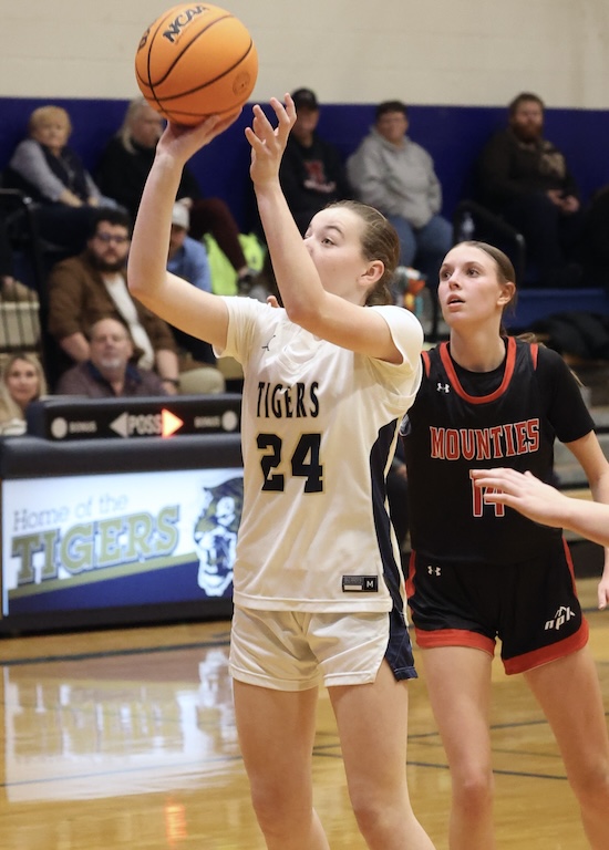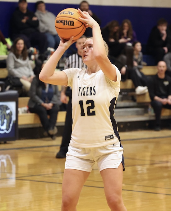 Avalon Rew hit a free throw for NPM and after the Tigers’ full-court press caused a Liberty turnover, Kameron Lightner took advantage of Litzelman’s absence and scored inside, got the ‘and-1’ call and hit the free throw to make it 46-41 NPL with 2:28 left.