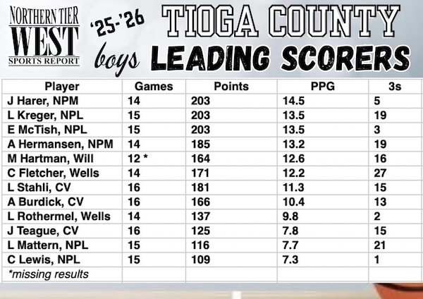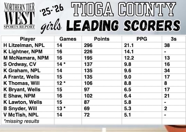 TIOGA COUNTY — Here's a current look at the top scorers in boys' and girls' high school basketball in the West.