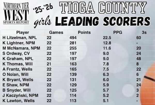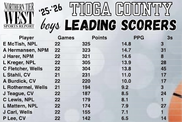 Northern Tier West Sports ReportTIOGA COUNTY — With the playoffs looming and a number of teams having already wrapped up their seasons, here’s an updated look at the regular season scoring leaders for boys and girls basketball in the West.