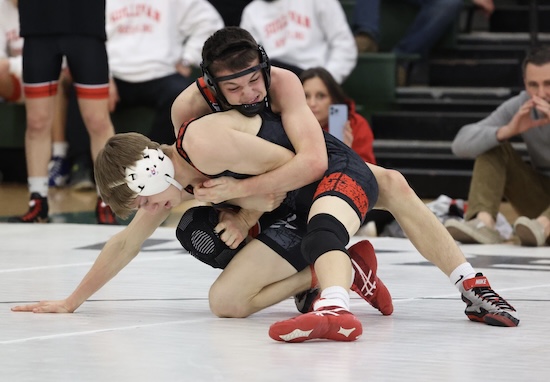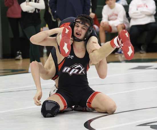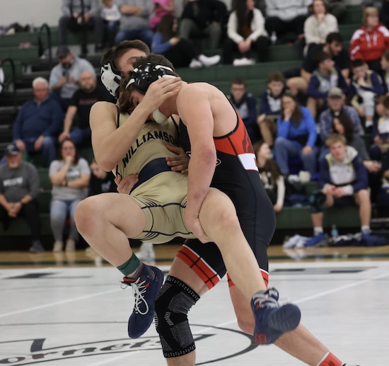 Pequignot tech falled his way to the 121 pound title .. with a 16-1 win in 46 seconds to open the tournament, a second period, 18-2 win over Williamson’s Walker Hyde in the semis and a first period, 17-2 win over Towanda’s Brayden Fessenden to claim his third Sectional title.