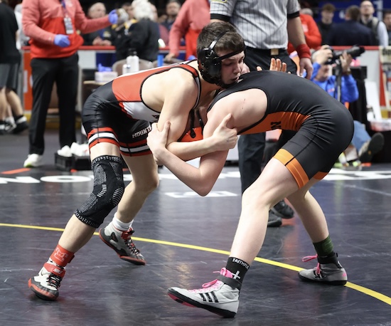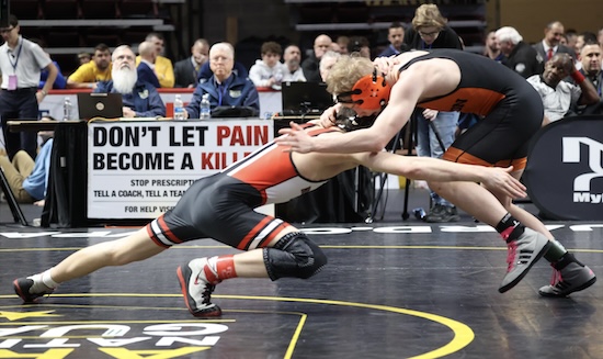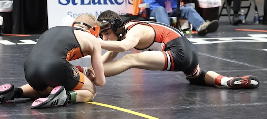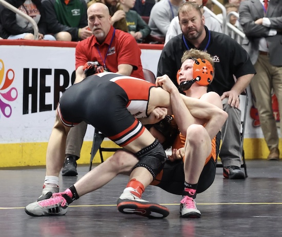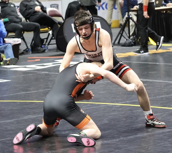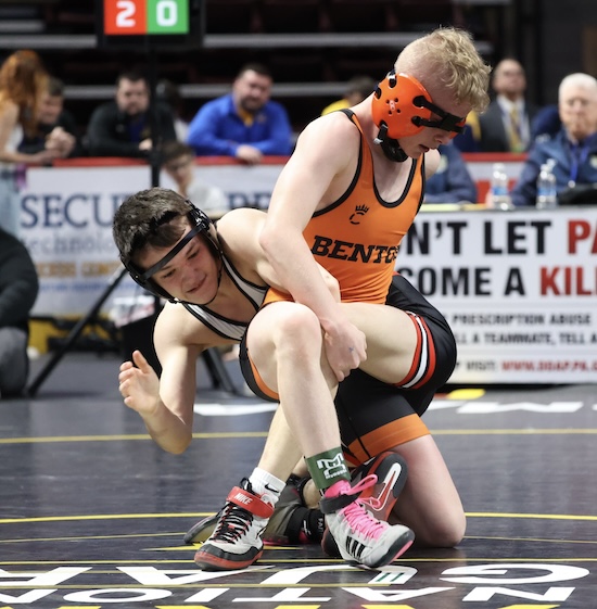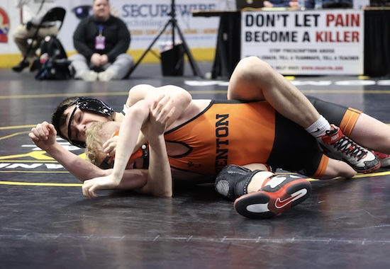 Nickerson was 1-2 against Collae this season before Saturday, having beaten the Benton freshman 8-3 at Districts and losing 3-1 to him at the Mid-Winter Mayhem and 2-1 in last week’s North East Regional semifinal. Nickerson was called for an illegal move (figure four leg lock) during sudden victory and Collae was awarded a point and the win.