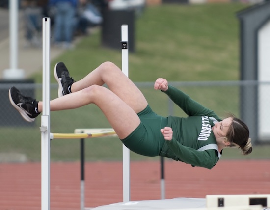In the 100m hurdles, Jennifer Belz was 2nd (18.59), Olive Twoey was 3rd (19.03), Kaci Kosek was 4th (20.28) and Lillian Sprouse was 5th (20.45).